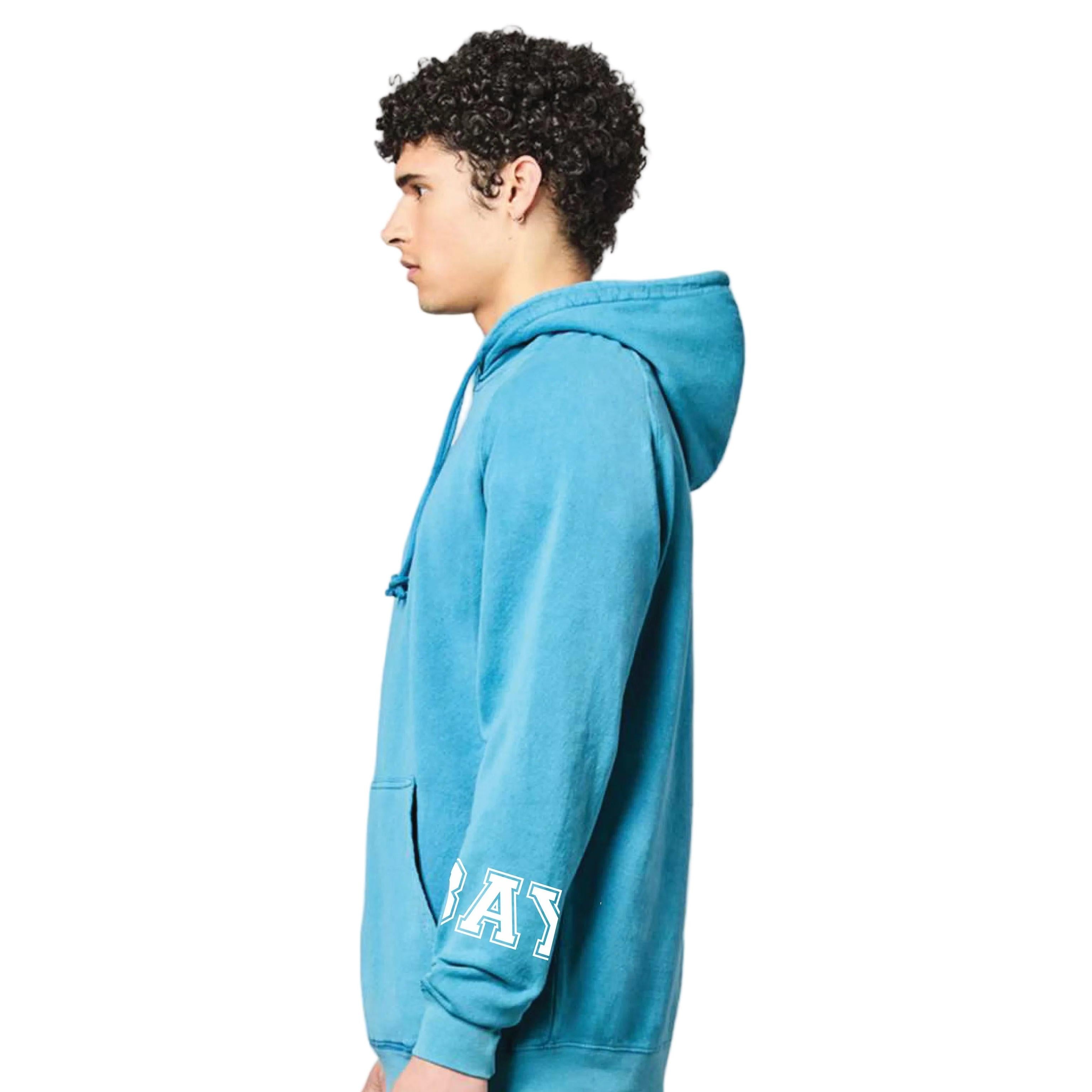 Premium mineral washed Hoodie in lake blue with a collegiate appeal.